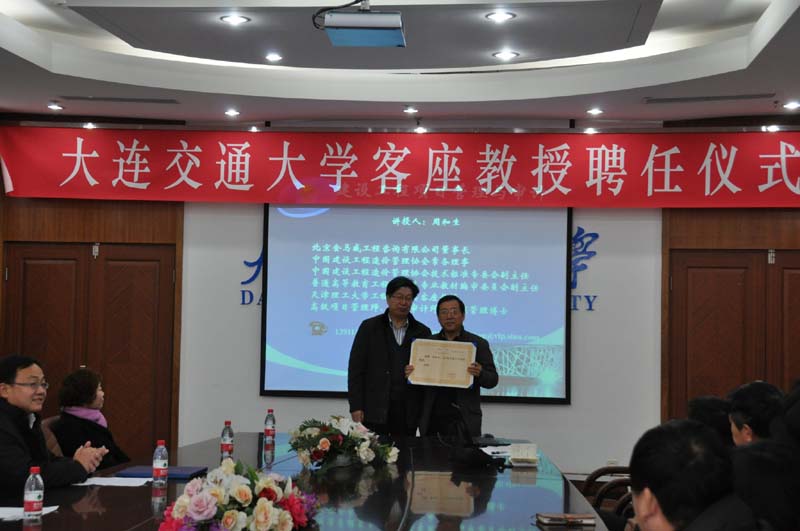 2013年1月9日,應(yīng)大連交通大學(xué)邀請,我公司董事長周和生先生受聘為大連交通大學(xué)工程管理類學(xué)科客座教授,頒發(fā)客座教授聘書。