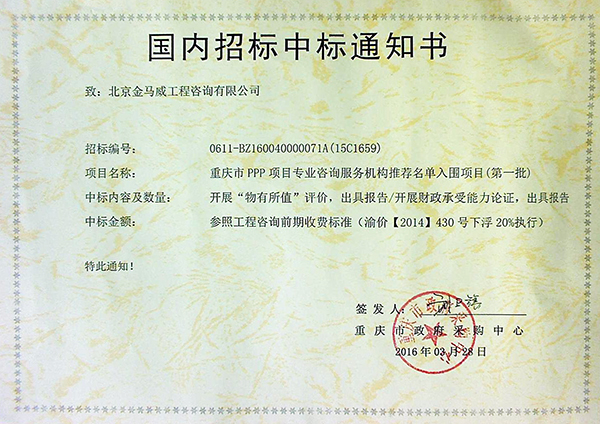 3月28日,北京金馬威工程咨詢有限公司經(jīng)重慶市政府采購中心評(píng)審,中標(biāo)重慶市PPP項(xiàng)目專業(yè)咨詢服務(wù)機(jī)構(gòu)推薦名單入圍項(xiàng)目(第一批)。