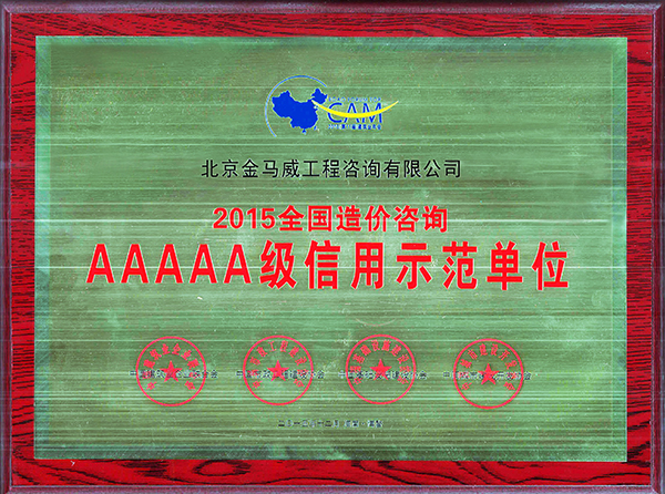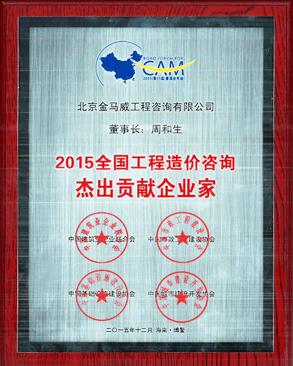 2015年12月25日,由中國建筑業(yè)企業(yè)聯(lián)合會(huì)發(fā)起,聯(lián)合中國基礎(chǔ)設(shè)施建設(shè)協(xié)會(huì)、中國市政工程建設(shè)協(xié)會(huì)等單位聯(lián)合主辦的“博鰲論壇·2015(筑業(yè)年會(huì)”在海南博鰲順利召開, 年會(huì)現(xiàn)場同時(shí)發(fā)布了2015年度優(yōu)秀企業(yè)和優(yōu)秀人物等以及2015中國建筑業(yè)優(yōu)秀企業(yè)和人物的頒獎(jiǎng)榜單,金馬威榮獲“2015全國造價(jià)咨詢AAAAA級(jí)信用示范單位”,周和生董事長榮獲“2015全國工程造價(jià)咨詢杰出貢獻(xiàn)企業(yè)家”榮譽(yù)稱號(hào)。