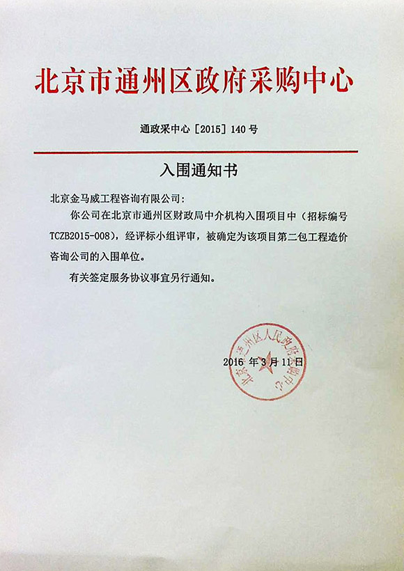 3月11日,經(jīng)公開招標(biāo),公司入圍“北京市通州區(qū)財(cái)政局中介機(jī)構(gòu)入圍評選采購項(xiàng)目”(招標(biāo)編號:TCZB-2015-008)。據(jù)了解,一共有多家工程造價(jià)咨詢公司參與了投標(biāo),北京金馬威工程咨詢有限公司經(jīng)評標(biāo)小組評審,被確定為該項(xiàng)目第二包工程造價(jià)咨詢公司的入圍單位。
